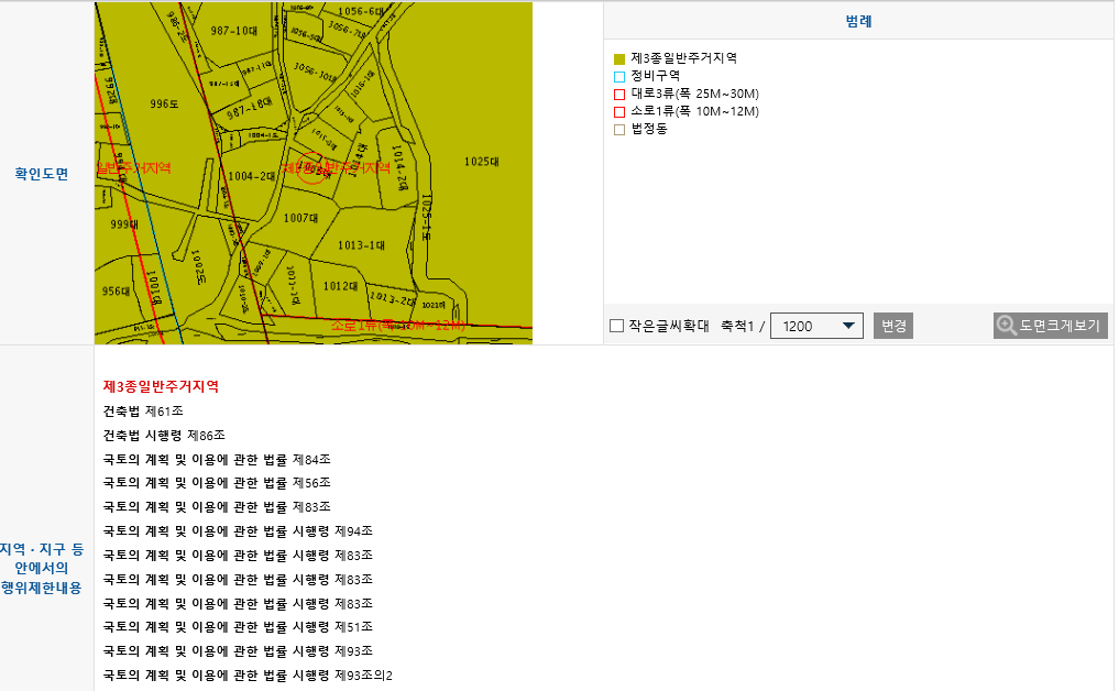 도로에 접한 부분의 길이가 얼마인지, 대지의 지역, 지구, 면적 등을 한번에 확인 할 수 있습니다.